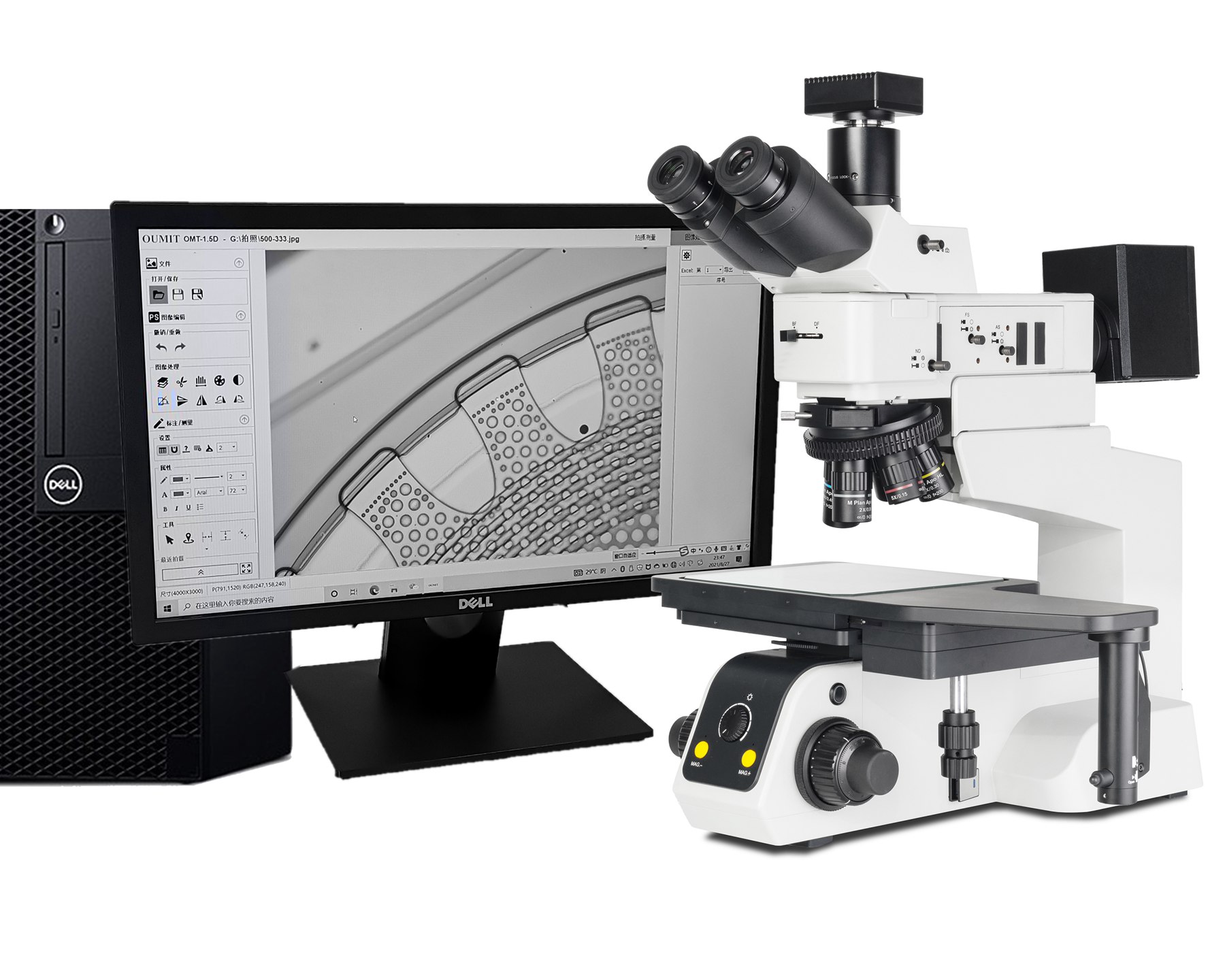 大多数失效分析和研发实验室对缺陷测量、报告创建和图像存档的要求都需要数字解决方案。鉴于本应用的固有性质,真实对比度极低,必须通过图像分析软件进行优化。照明的不均匀性会导致图像四角向中心渐晕或变暗,必须采用数字手段从实时视图和捕获图像中予以消除。反射光显微镜非常适合于从上方照亮样品,但透射光IR设计为通过硅片从样品下方照亮样品,从而增强对比度。因此,透射光尤其适用于通过硅片检查图形对准或框标。